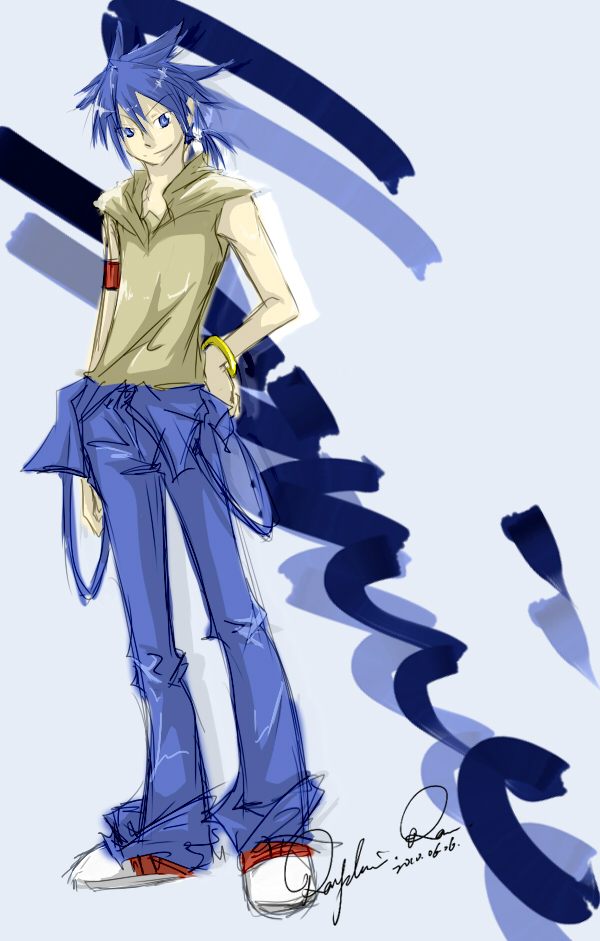 而少年已經很快地洗好,一頭耀眼的金髮解散了披在肩上,濕答答的。身上也換上了乾淨的背心和短褲。一如既往的黑,和乾淨的藍。
